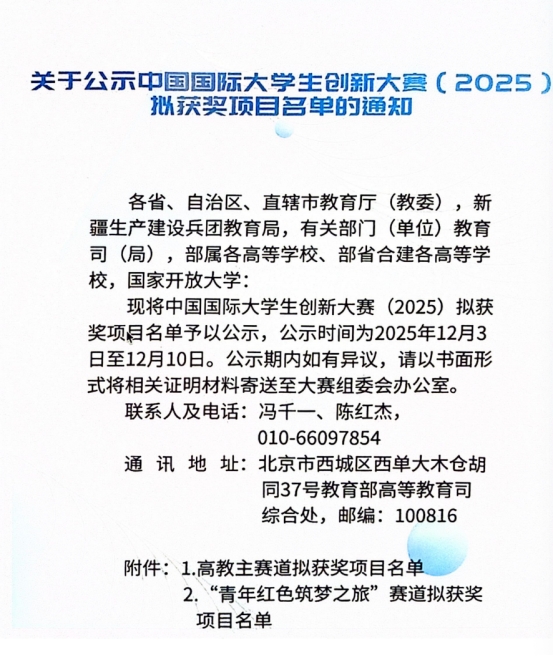 由教育部、中央统战部、中央网信办等12部门与郑州市人民政府联合主办,郑州大学负责承办的中国国际大学生创新大赛(2025)比赛,近日通报比赛结果,我校取得历史性突破,荣获国家级银奖一项。